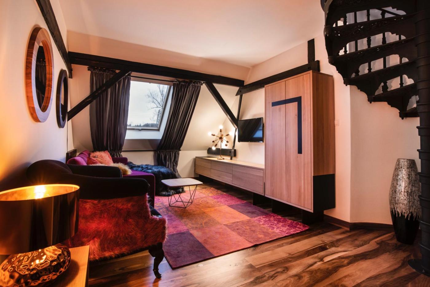 Pokój dwuosobowy typu Deluxe (4). The double room features a private bathroom, air conditioning, a tea and coffee maker, as well as a seating area with a flat-screen TV. The double room provides a wardrobe, a sofa, parquet floors, heating, as well as a TV. The unit offers 2 beds. Pokój Dwuosobowy - 4 osobowy. Powierzchnia pokoju ok.: 21 mkw. ;